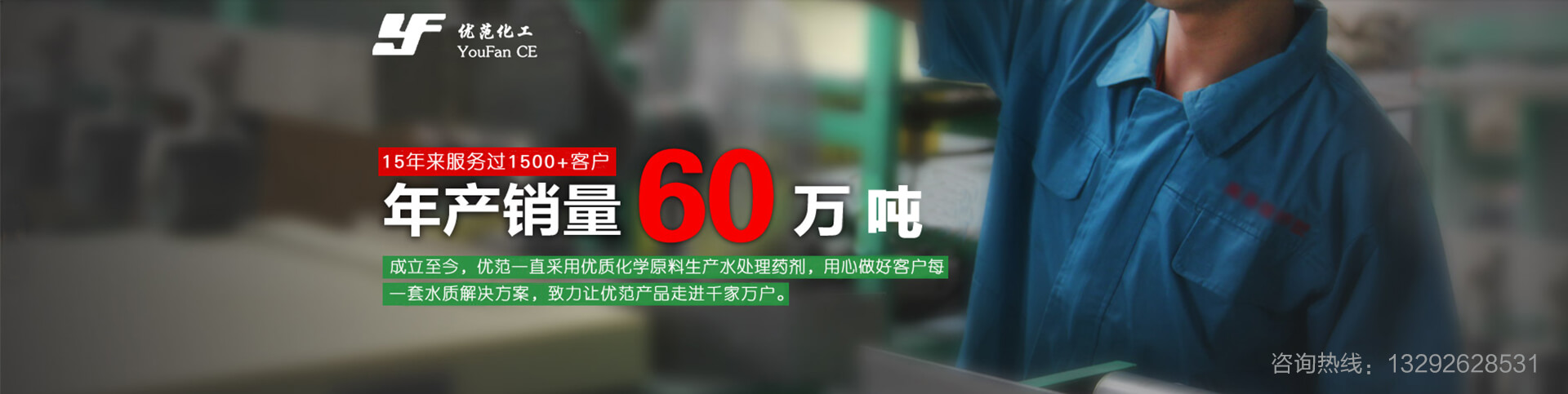 始于2005年,資質健全,諸多榮譽,15年專業水處理藥劑研發生產商。專注于對阻垢劑、殺菌滅藻劑、反滲透膜阻垢劑、速效除垢劑、清灰劑、污水處理藥劑等多種水處理藥劑的科研、設計、生產、銷售及售后服務。擁有現代化生產車間及高精度的水質檢測設備,鑄造年產量60萬噸的超強生產力,可提供藥劑種類超過200種。從產品到售后,優范環保科技提供專業一站式服務,創百萬用戶認可的好品質!